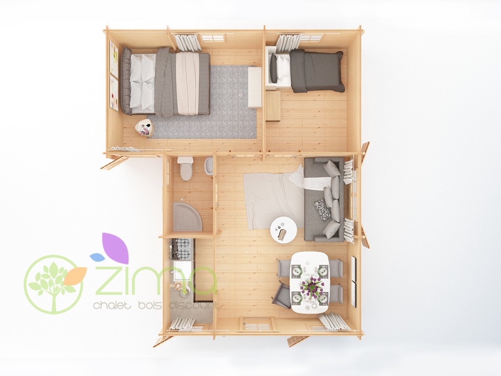 Le modèle Var se divise en 4 pièces dont deux chambres utilisables également en bureau, d’une salle de bain et d’un séjour spacieux pour se retrouver en famille. Ses murs en bois massif et le double vitrage aux fenêtres vous permettent de profiter d’un endroit agréable au fil des saisons.