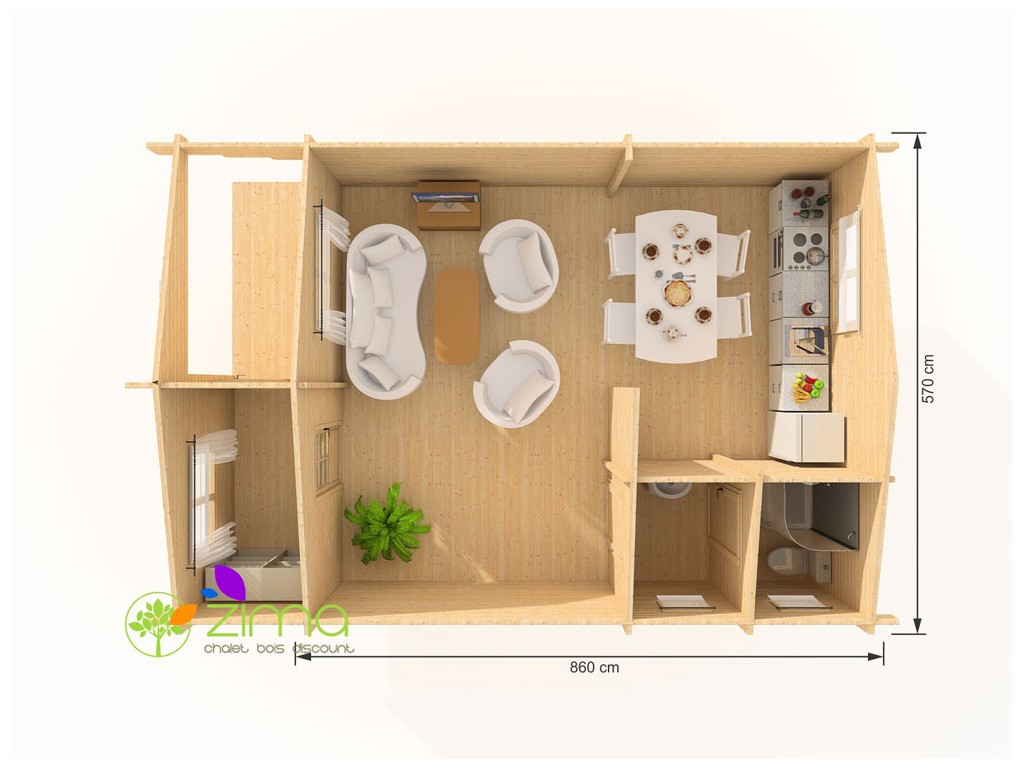 Les nombreuses fenêtres offre une belle luminosité pour profiter de l’extérieur tout en restant au chaud grâce au vitrage thermique et aux murs en pin massif de 66mm. Avec un hall d’entrée séparé de la pièce principale vous pourrait découvrir un espace supplémentaire qui ravira les adeptes du rangement.