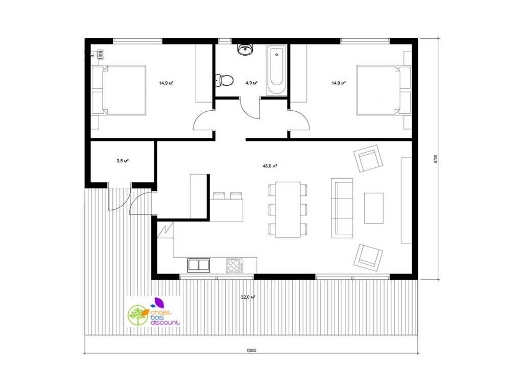 Dimensions extérieures Mur (largeur x profondeur): 12,00m x 9,1m + 2,1 terrasse