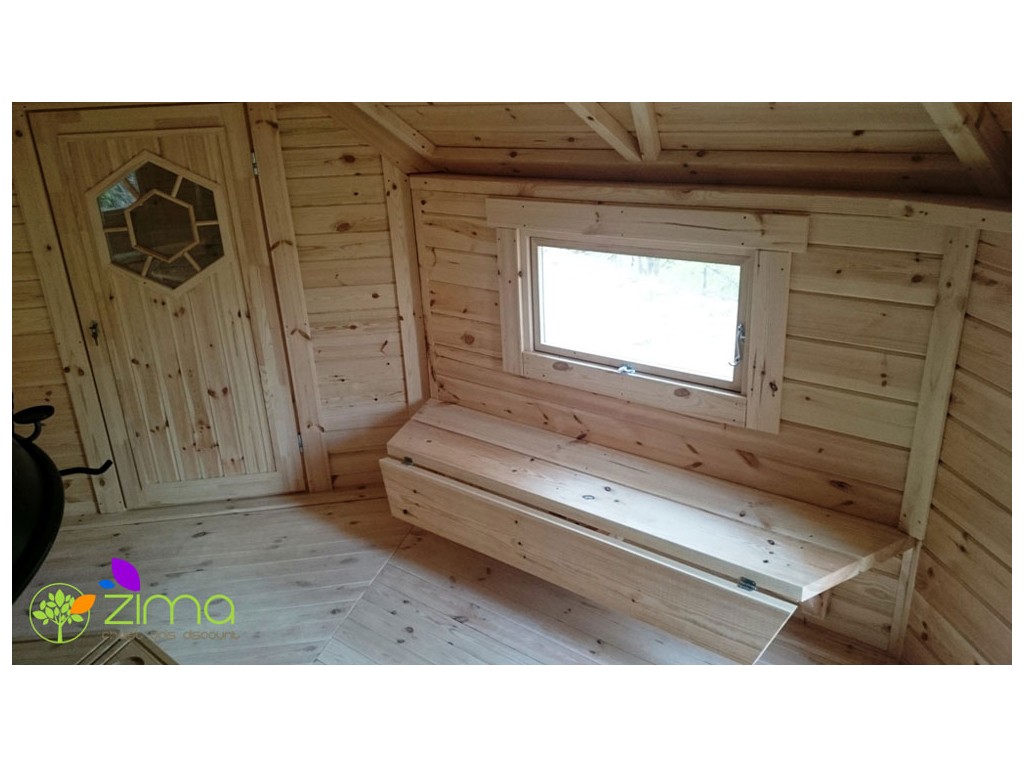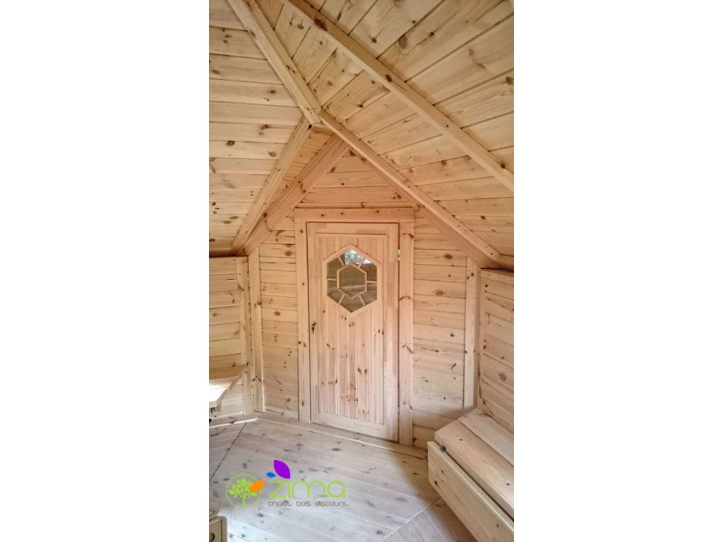Ce magnifique Kota finlandais possède une extension idéale pour aménager un véritable petit nid douillet où recevoir vos proches. Sa forme octogonale lui confère un caractère authentique et original qui s’harmonisera très bien avec vos extérieurs. Modulable il est possible d’ajouter plusieurs extensions afin de s’adapter parfaitement à vos activités. Par ailleurs, deux bancs peuvent se transformer en couchette et proposent ainsi un coin nuit où passer des nuits au chaud.