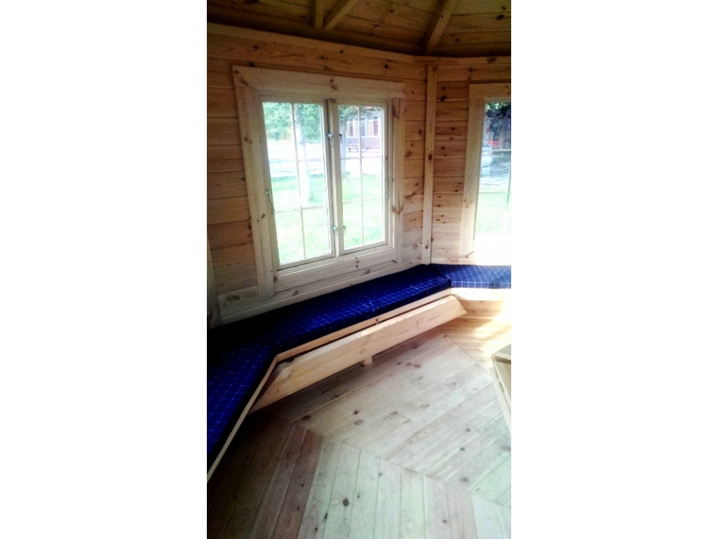 Ce pavillon de jardin allie l’utile à l’agréable grâce à sa structure en pin massif qui offre tout le confort du bois. Le montage facile ne vous demandera seulement quelques jours et de l’huile de coude. Cette pièce de 16.5m² laissera entrée la lumière naturelle par les fenêtres double vitrage présentes sur tous les murs. Par ailleurs sa grande superficie permet d’accueillir jusqu'à 25 personnes qui pourront s’assoir sur les 7 banquettes que compose la gloriette.