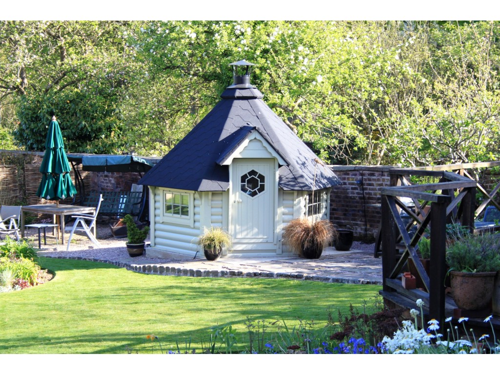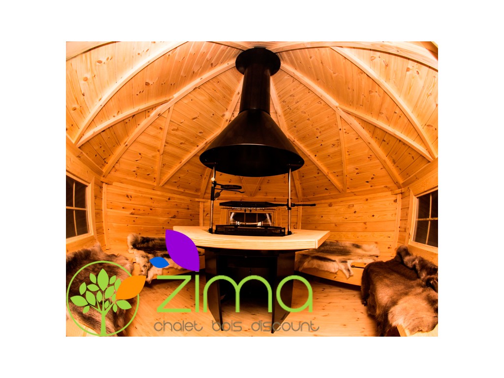 Ce chalet est fourni avec le grill, les banquettes et les coussins, cependant il est possible d’enlever le grill afin de créer une vraie pièce qui servira d’extension à votre propre maison. Comme cuisine extérieure ou comme lieu de rangement, ce kota finlandais ravira toute la famille.Chalet kota grill 9.2m2 ouvert - Madriers demi rondins de 45mm