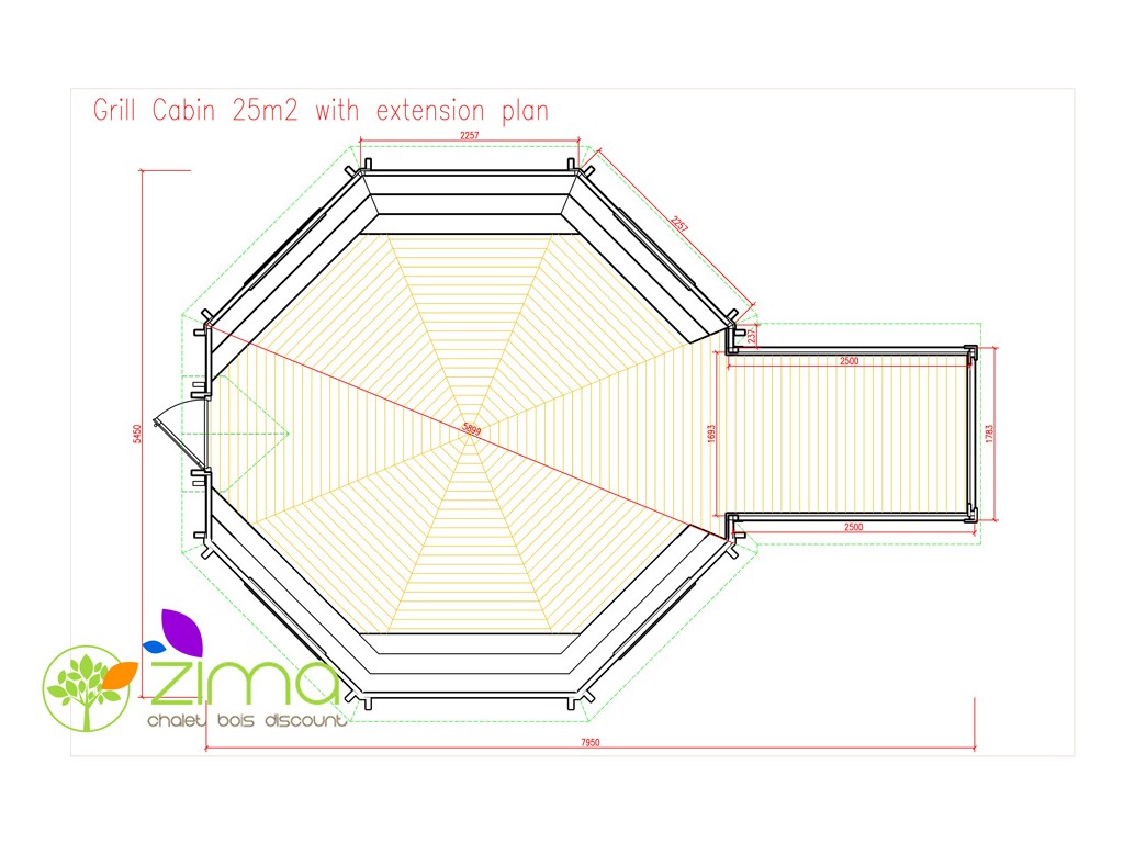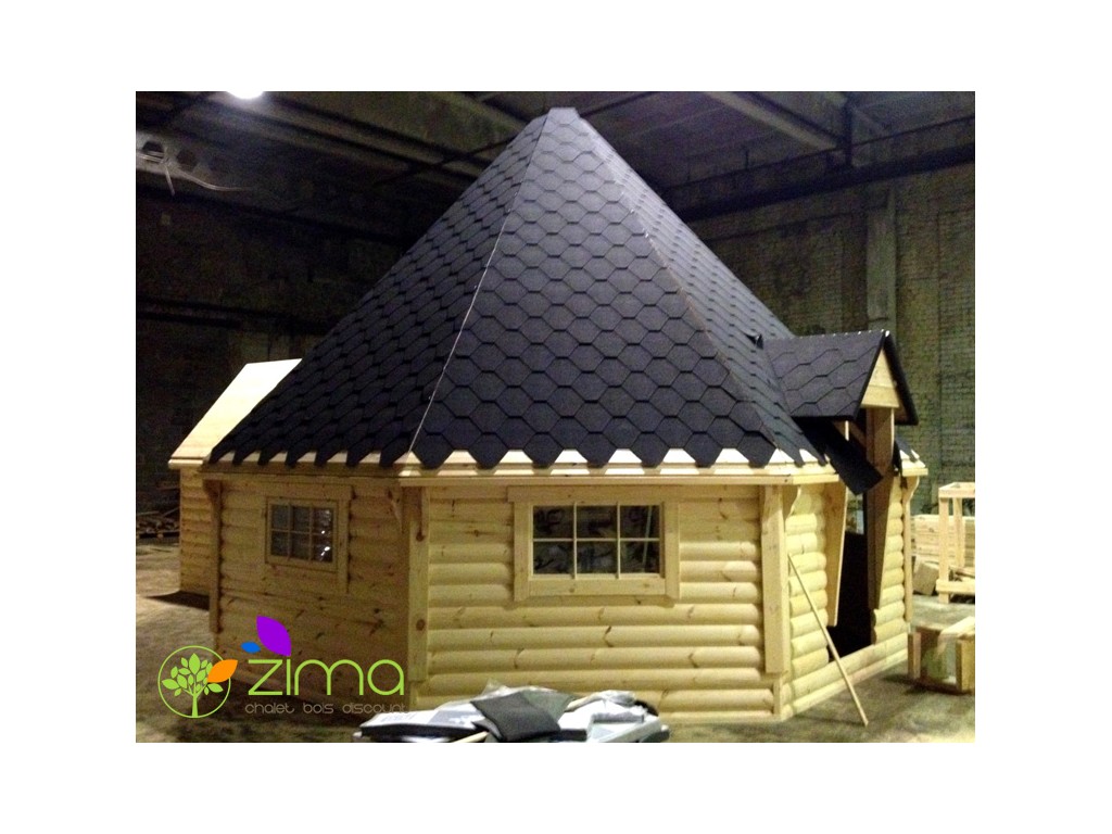 Vous ne verrez jamais un chalet plus spacieux que celui-ci. Avec sa forme octogonale et sa hauteur sous plafond exceptionnelle vous vous y sentirez comme dans un palace. Capable d'accueillir 30 personnes autour de son magnifique grill inclus, vous pourrez y organiser les plus belles soirées de votre vie. Équipé de 6 banquettes confortables avec leurs coussins douillets, vos amis et votre famille ne voudront plus quitter votre chalet. Dans son extension de 4,5m2, vous pourrez aménager une salle d'eau ou une chambre d'amis et ainsi rendre votre kota grill encore plus fonctionnel. Deux banquettes peuvent être converties en couchage ainsi vous pourrez offrir de passer une nuit exceptionnelle et atypique à quelques petits chanceux.